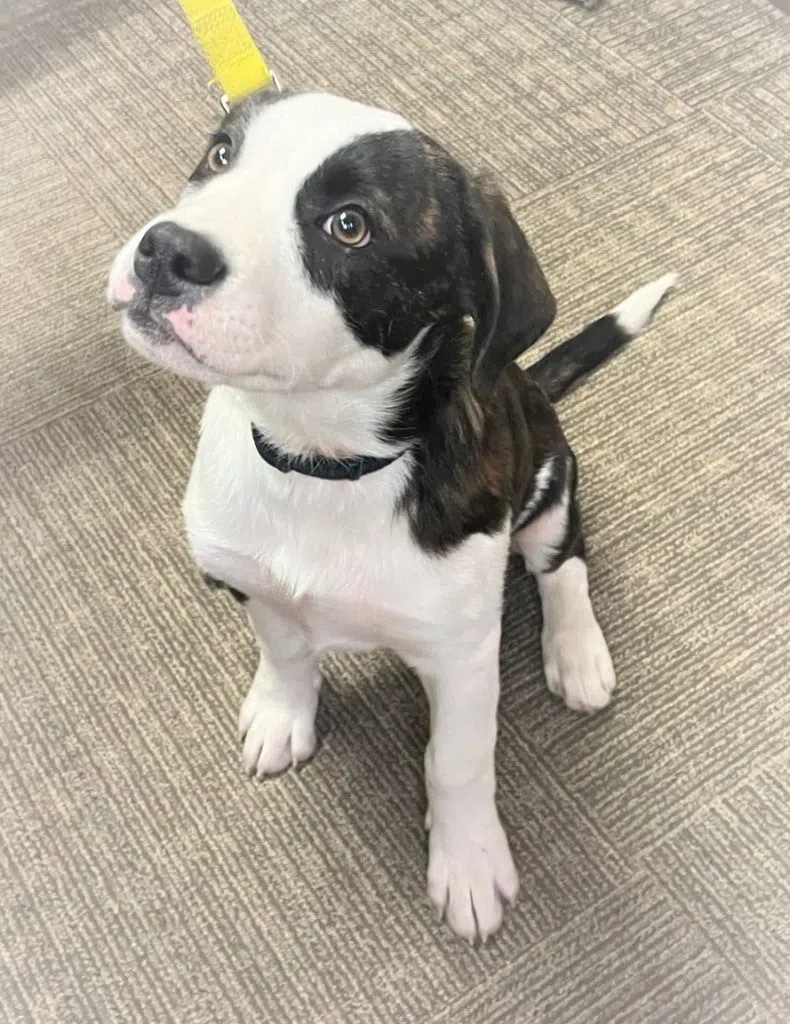ADOPTED! Panda. 4-month-old, male. He has been vet checked, vaccinated, and dewormed; he will be neutered in June 2023. Panda currently weighs 11.5 kg. This big boy is potty trained but sometimes needs to be reminded. He will sleep in a kennel and is excellent walking on a leash. Panda loves kids, cats, and some other dogs. Panda might get nervous around male dog or bigger dogs. The foster family works on socializing him with other dogs often. He is a sweetheart and wants to cuddle and give kisses to everyone! Contact: pawsandclawsyorkton@gmail.com or visit the website www.pawsandclawsyorkton.ca